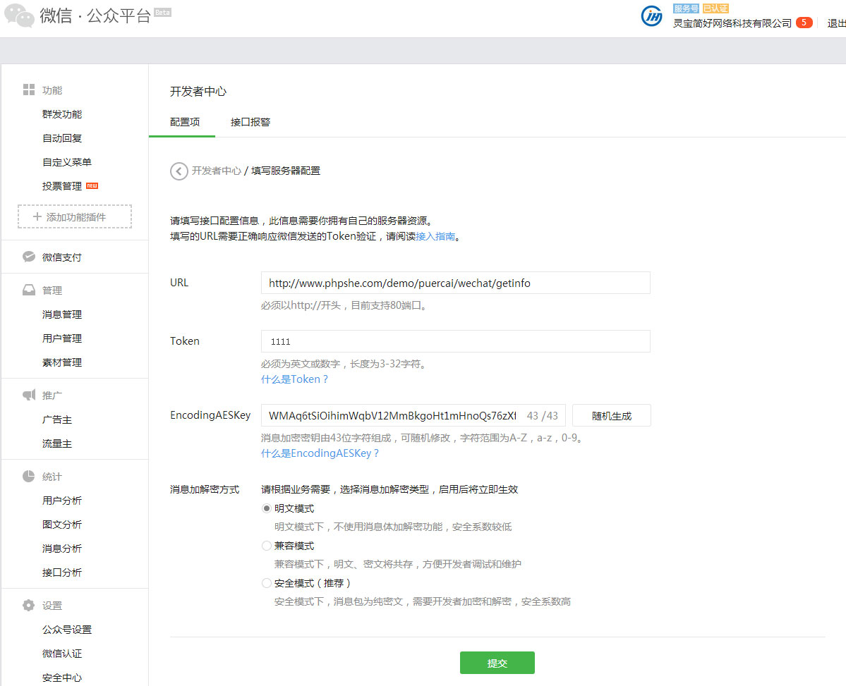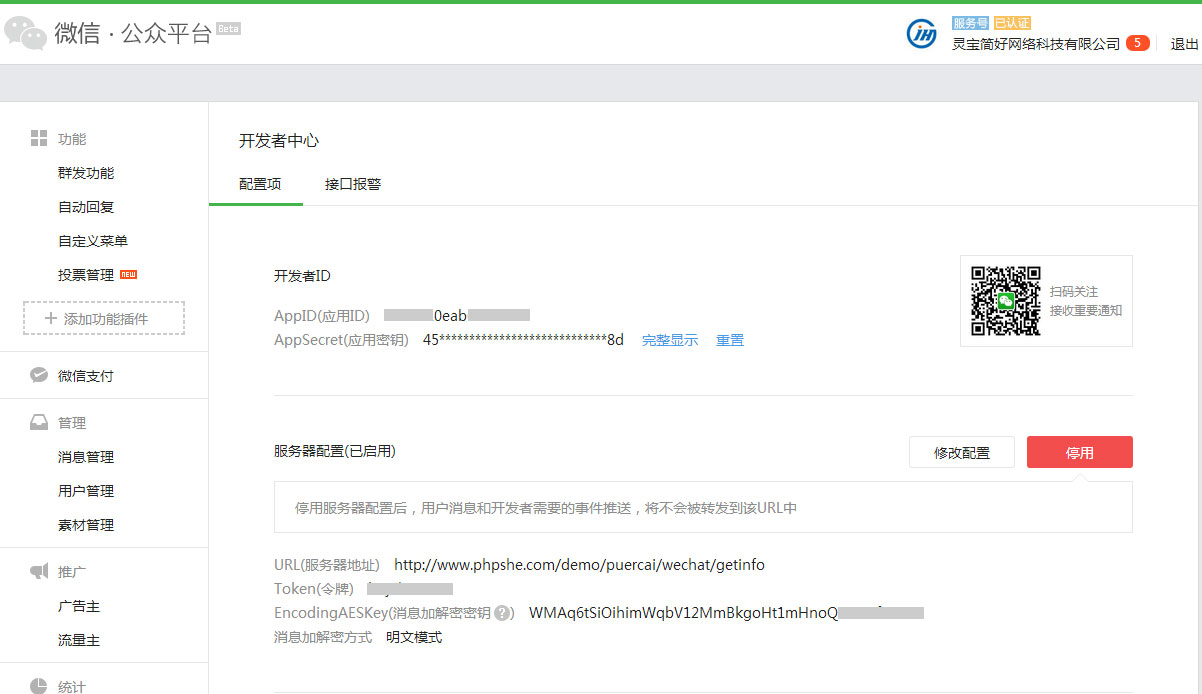 很多重要的參數(shù)配置都在這個(gè)欄目下進(jìn)行配置,尤其是其中的AppID,AppSecret,填寫到PHPSHE的后臺(tái)管理中,這些重要的參數(shù)也是微信平臺(tái)與PHPSHE進(jìn)行交互基礎(chǔ)。