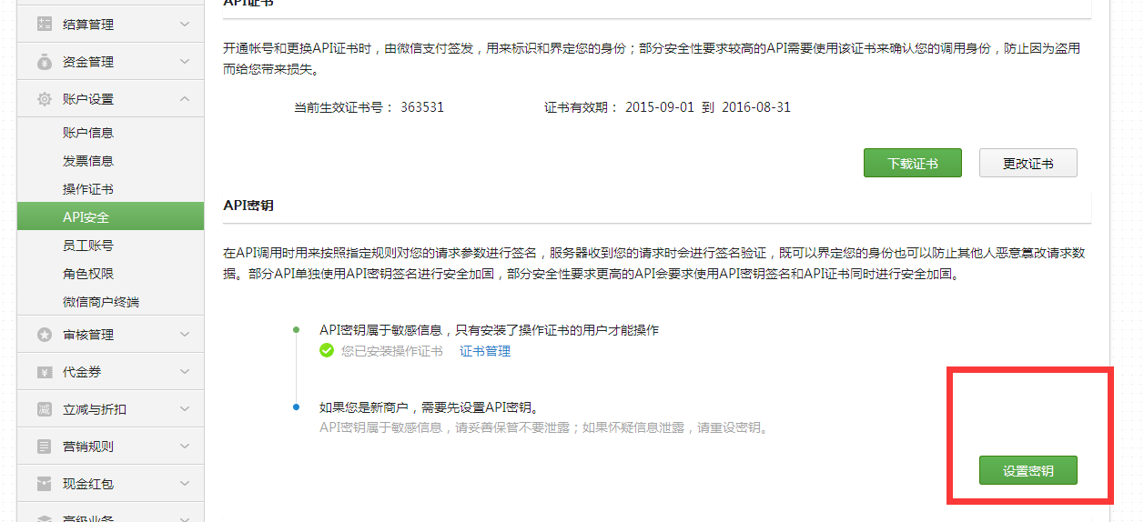 登錄【微信支付商戶平臺】https://pay.weixin.qq.com/index.php/home/login(帳號密碼從您微信支付的開通郵件中獲得),api密鑰為32位字符,自己按下圖處隨便填寫32位字符即可。