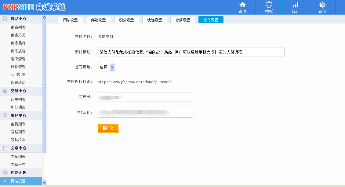 三、返回PHPSHE商城網(wǎng)站后臺,填寫商戶號和api密鑰