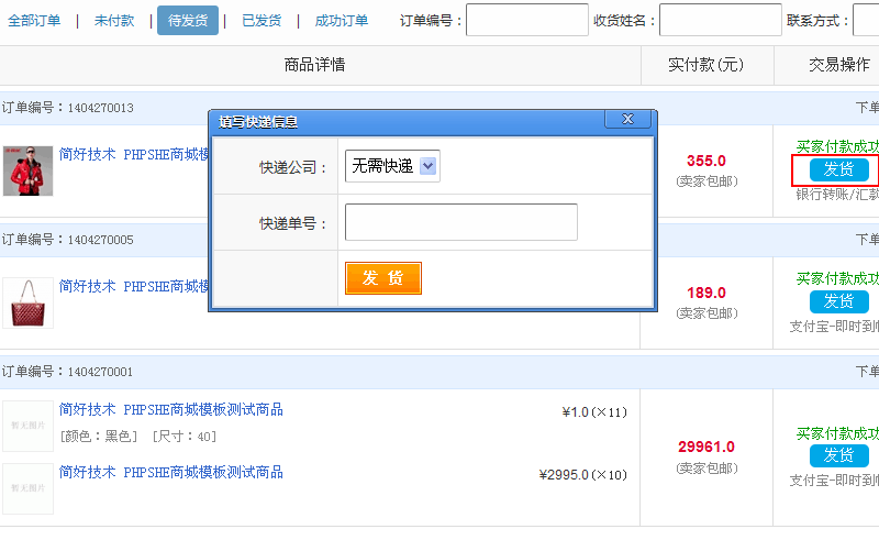 5.待發(fā)貨訂單頁面,點(diǎn)擊“發(fā)貨”按鈕后填寫物流信息,如圖所示:
