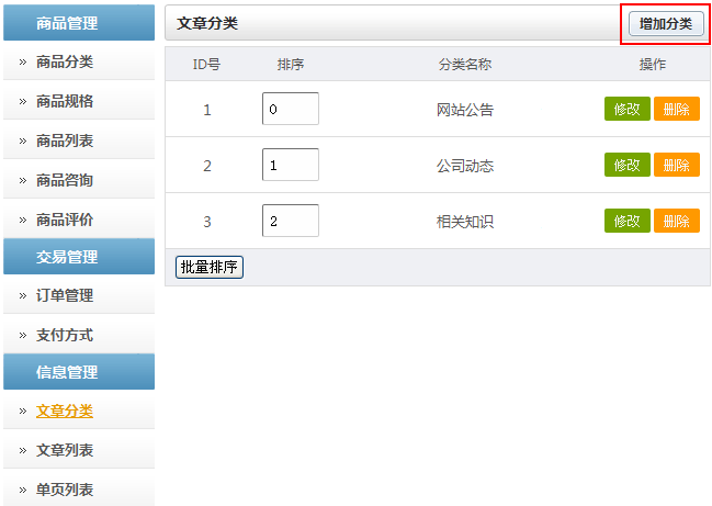 1.點擊“文章分類”可以編輯分類名稱,調整分類顯示順序,刪除分類,如下圖所示: